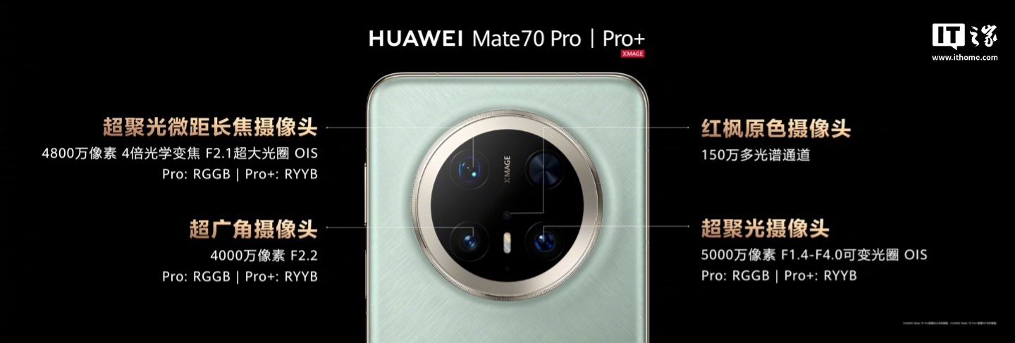 华为 Mate 70 系列主摄采用了 5000 万像素(f/1.4-f/4.0 可变光圈,OIS)、4800 万像素(4X,f/2.1 OIS)长焦镜头、4000 万像素(f/2.2,支持最近 5cm 对焦)超广角镜头,而且 Pro+ 的长焦、超广角均为 RYYB 传感器配资知名股票配资门户,Pro 均为 RGGB 传感器。