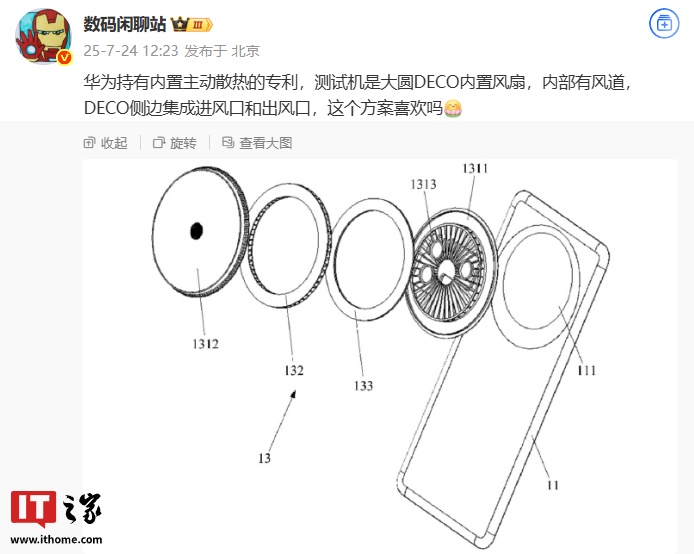 博主随后发文介绍,华为持有内置主动散热的专利,测试机是大圆 DECO 内置风扇,内部有风道,DECO 侧边集成进风口和出风口。